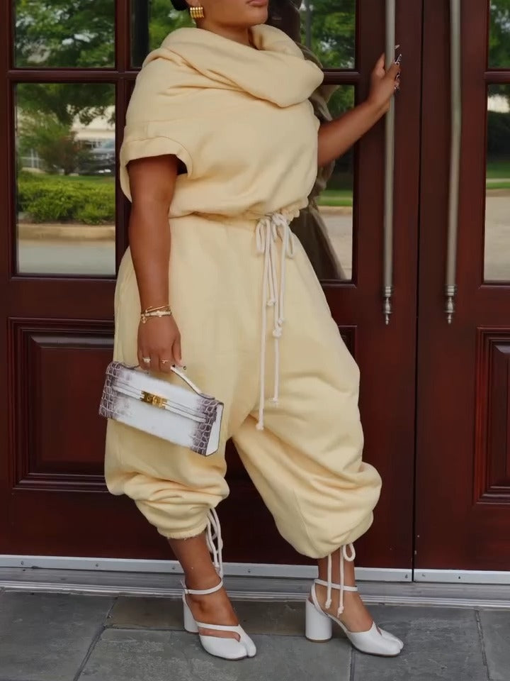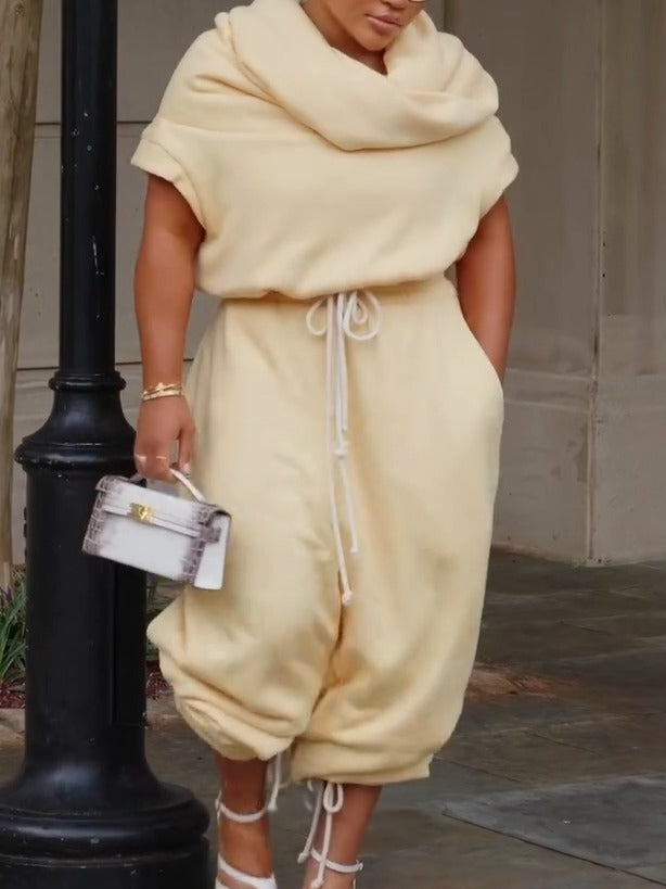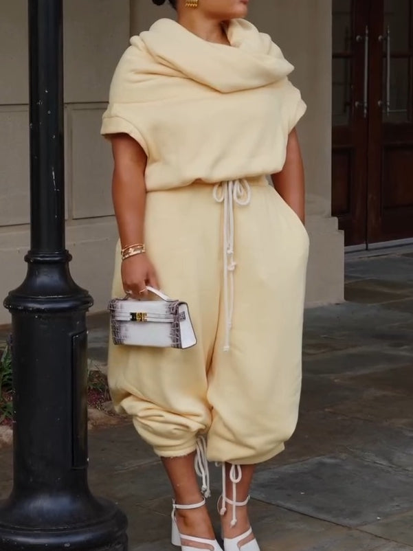 Ultra high cowl, cropped "hoodie" vest. Cotton drawstring at waist and capped sleeves. Fabric is doubled for a super cozy and luxe feel.