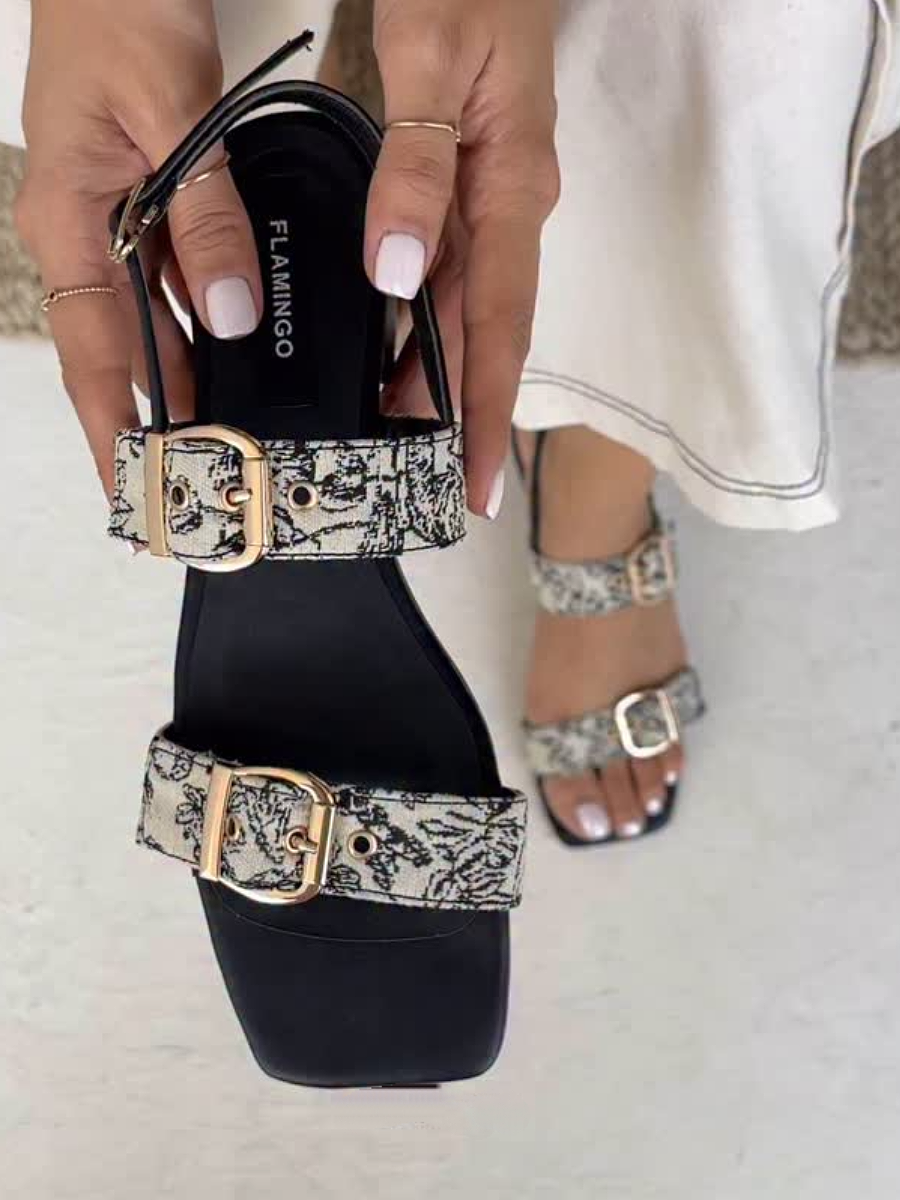 Sling-back styling. Faux leather footbed and lining. Dual buckle closure vamp with silver-tone grommet detailing. Stacked heel design.