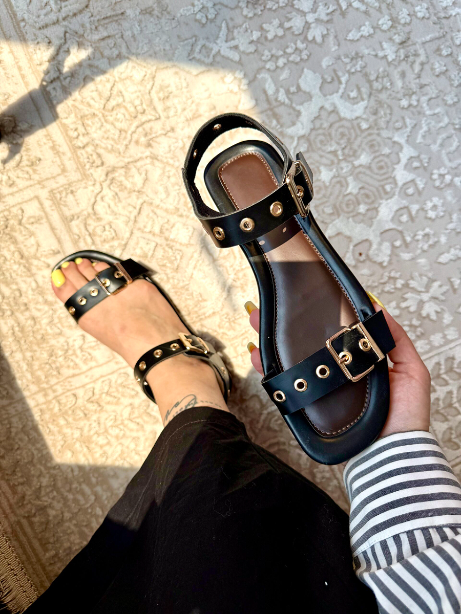 Perforated-Eye Metal-Buckle Flat Sandals
