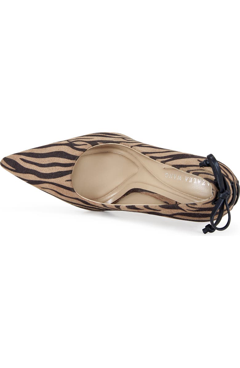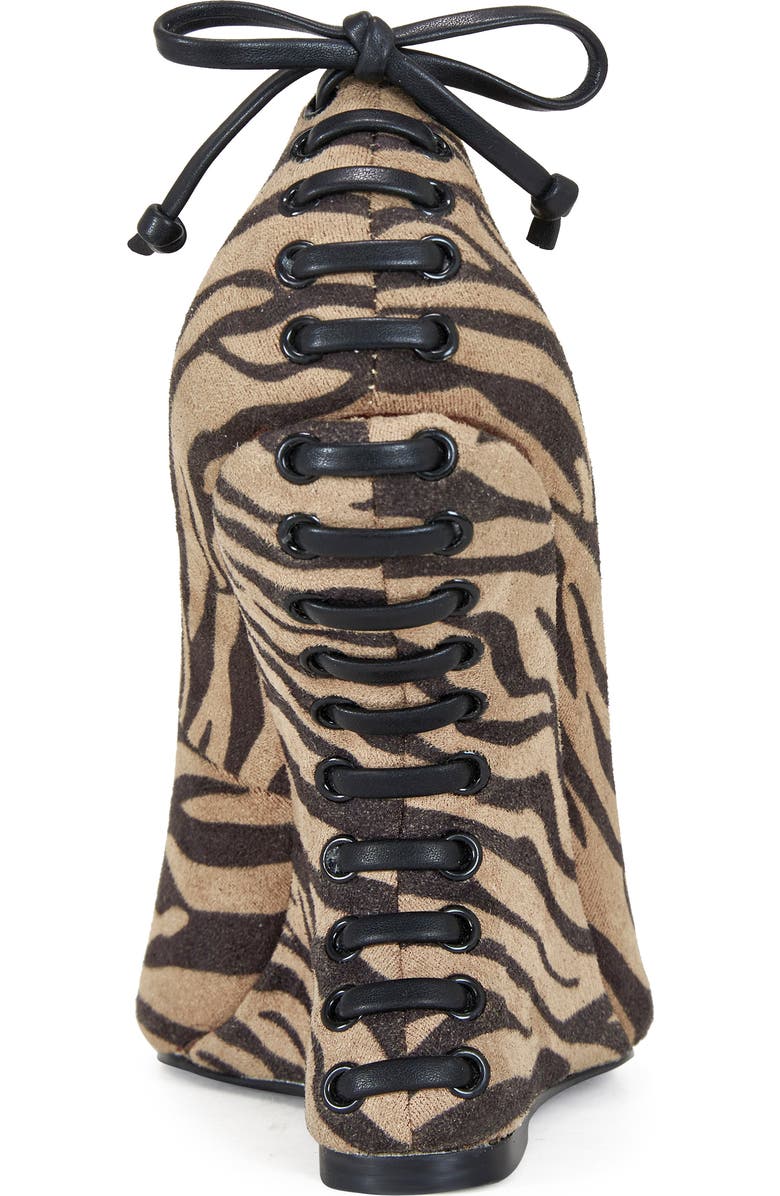 Blur the line between art and fashion with this sculptural pump set upon a towering, dramatically curved wedge featuring corset-inspired laces.
