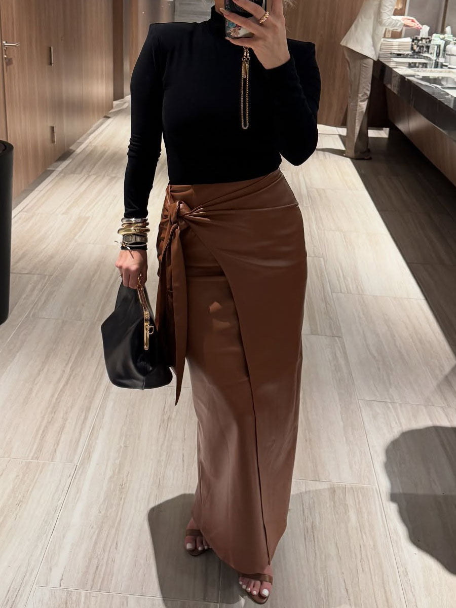 The Skirt is crafted from faux leather and features a fully lined interior, a hidden back zip closure, and a side drape waist tie accent. The skirt measures approximately 40 inches in length. It is a midi, wrap skirt.