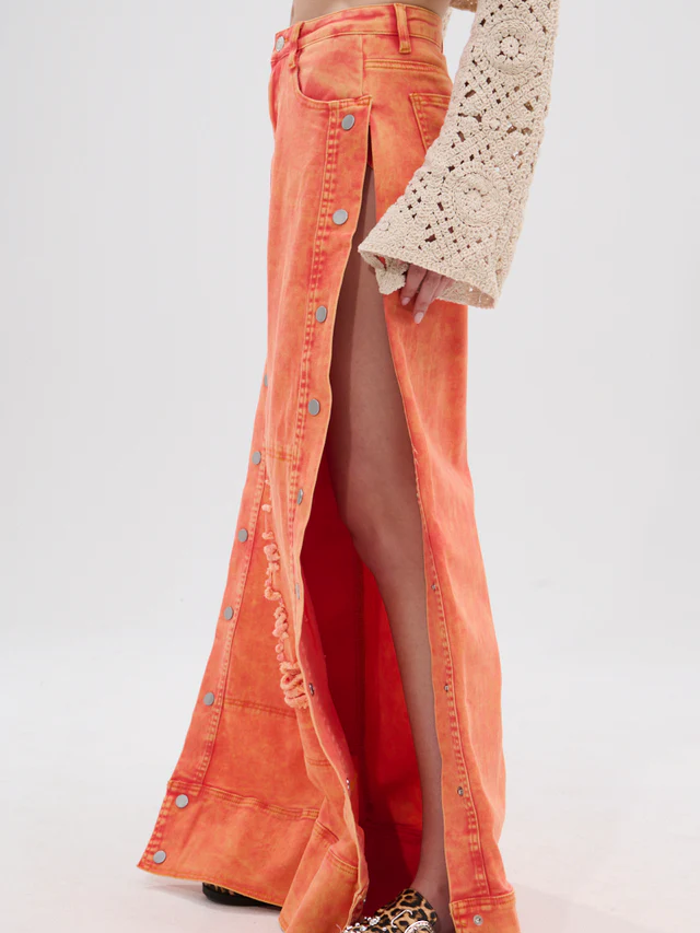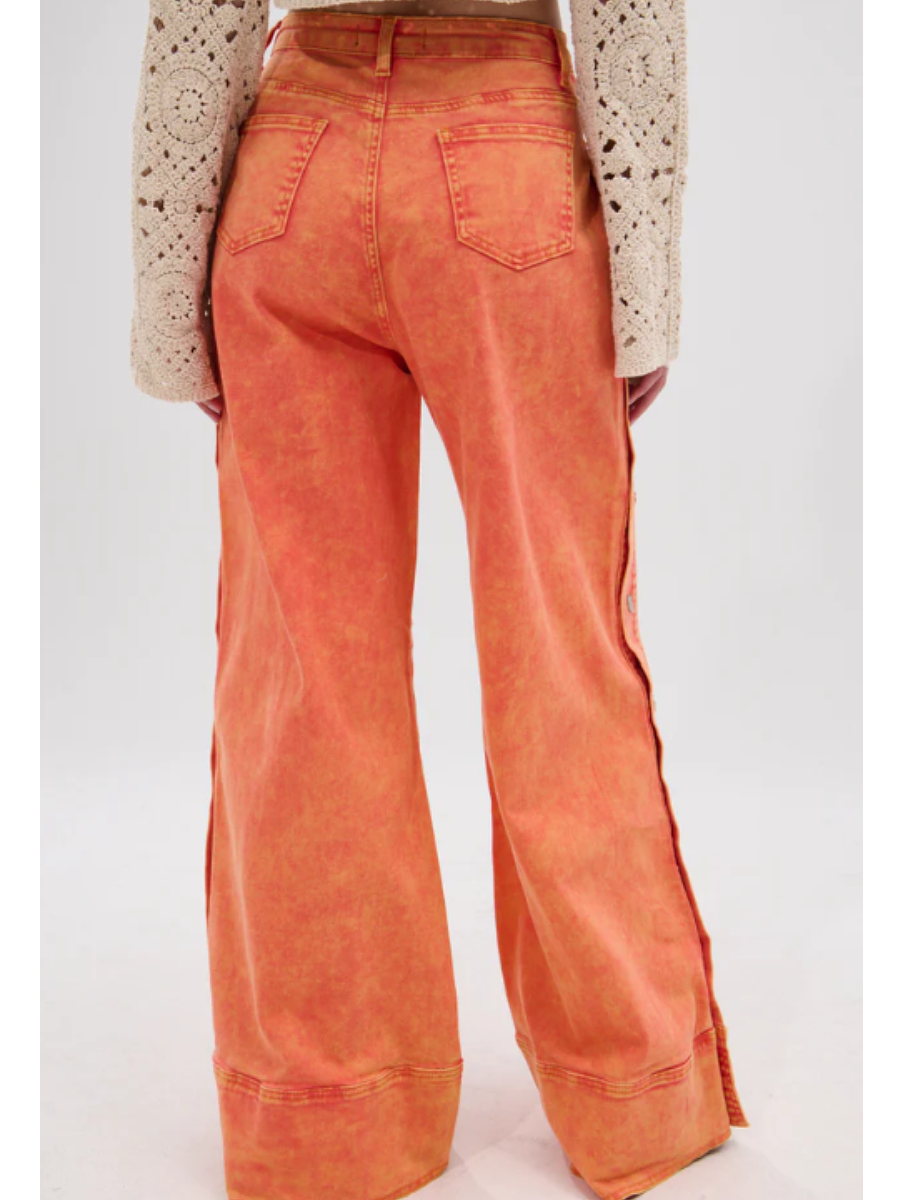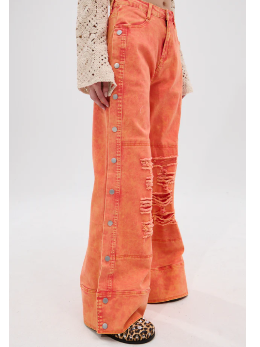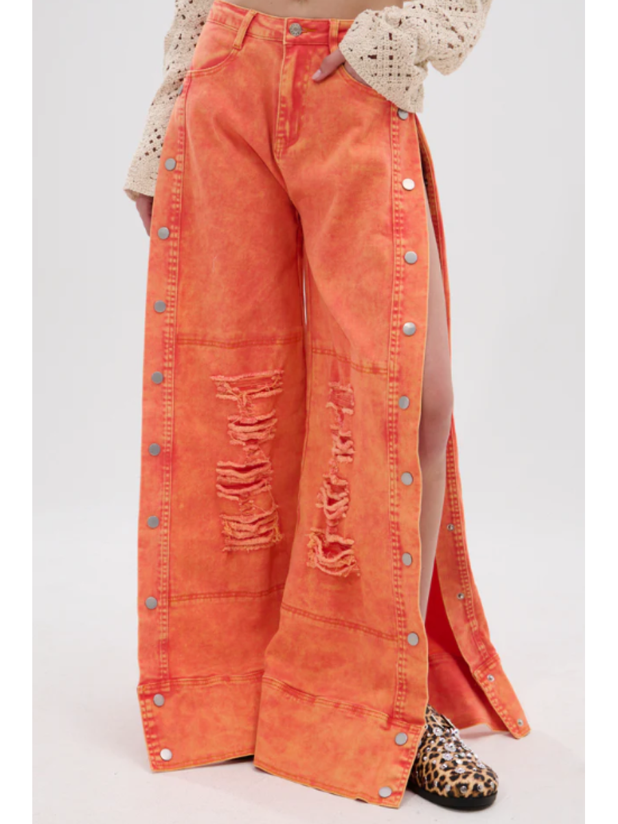 Elevate your wardrobe with some zesty denim. The Distressed Side Snap Jeans is a bold statement piece crafted from a bright orange, washed denim and features a high-rise fit, functional belt loops, a four-pocket design, ultra-ripped distressed detailing on the lower pant legs, full-length silver-tone snap buttons running down each side, and a front zip fly. Complete with a relaxed wide-leg silhouette. Pair with anything from a loose blouse to a cropped baby tee for an effortlessly cool finish.
