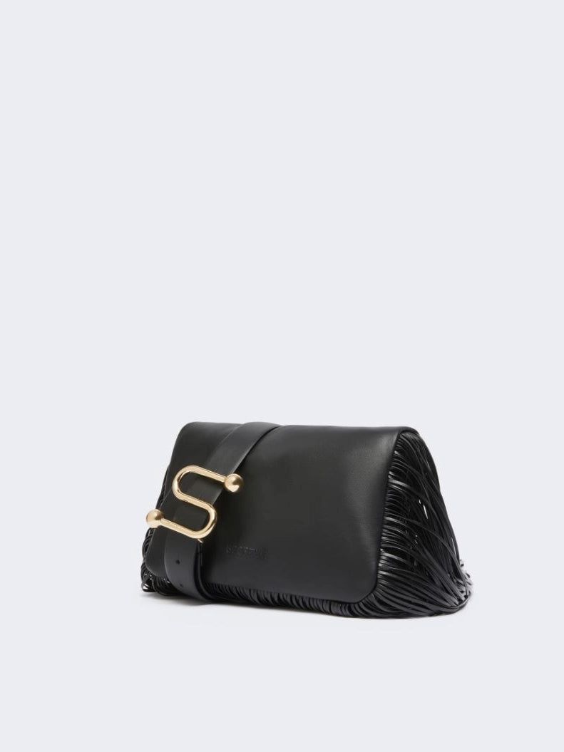 Mini envelope bag with flaps made of leather with internal padding and fringes at the hem. The flap closes with a magnetic button. Removable and adjustable shoulder strap completed by an S-shaped metal buckle. Carried by hand as a pouch or over the shoulder.